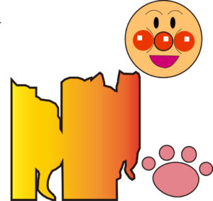 3枚目は飼い猫5匹の写真のシルエットと アンパンマンと肉球 | 中身の色をグラデーションにしてみました。 肉球は楕円ツールで塗りあり、線ありで作成。 アンパンマンの全身トレースに挑戦!!何とか頭部のみ完成。 身体までは授業時間内に出来ずに終了・・・。 |